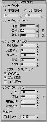 ヒント: 一般に、[率を使用](Use Rate)編集ボックスは、魔法の棒から流れるスターの跡のような連続するパーティクルの流れに対し最適ですが、[合計を使用](Use Total)編集ボックスは、短時間に発生するパーティクルのバーストに適しています。
