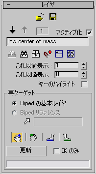 この領域にあるツールを使用すると、基本レイヤの IK コンストレイントを保持しながら、複数レイヤにわたって Biped をアニメートすることができます。また、シーン内の別の Biped を、現在の Biped の両手両足を再ターゲットするときの Biped リファレンスとして選択することもできます。