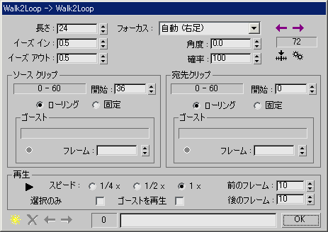 両方のクリップ内の Biped が一致するように、宛先クリップが回転され、位置が調整されます。[角度](Angle)編集ボックスを使って、宛先クリップの方向を変更できます。