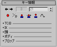 [キー情報](Key Info)ロールアウトは、[TCB]、[IK]、[頭](Head)、[ボディ](Body)、[プロップ](Prop)の各領域に分かれています。それぞれの領域名の横にある線をクリックすると、各領域を展開したり非表示にしたりできます。