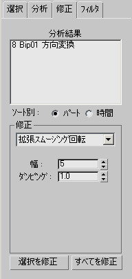 修正は、特定の Biped ボディ パーツまたはその組み合わせに対する特定の操作として、特定の時点に適用されます。一般に、修正を適用すると、キーの値が変更または削除されて、訂正されたモーションが生成されます。