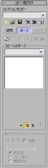 [コピー/貼付け](Copy/Paste)ロールアウトにあるコントロールを使用すると、Biped の 1 つのパーツから別のパーツに、または 1 つの Biped から別の Biped に、姿勢、ポーズ、またはトラック情報をコピーできます。