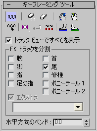 [キーフレーミング ツール](Keyframing Tools)ロールアウトのコントロールを使用すると、Biped または選択したパーツからのアニメーションのクリア、Biped アニメーションのミラーリング、親のスペースではなくボディ スペースでの首の回転を行うことができます。また、選択した水平方向キーの周囲で水平方向の重心トラックを曲げることもできます。