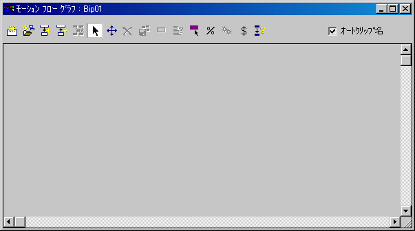 Biped で共有モーション フローを使用すると、グラフ ダイアログ ボックスのタイトルには、共有モーション フローの名前の前に「SHARED モーション フロー グラフ」と書かれます。共有(SHARED)モーション フローは 1 つのモーション フローを共有して複数の Biped を制御するのに使用されます。