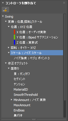 スケール リストオンにするとスケール コントローラが選択され、[Biped サブアニメーション](Biped SubAnim)トラックに集約されます。