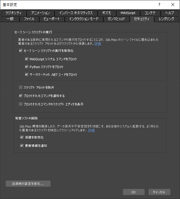 [基本設定](Preferences Settings)ダイアログ ボックスの[セキュリティ](Security)パネルで、[セーフ シーン スクリプトの実行](Safe Scene Script Execution)のオプションを設定します。