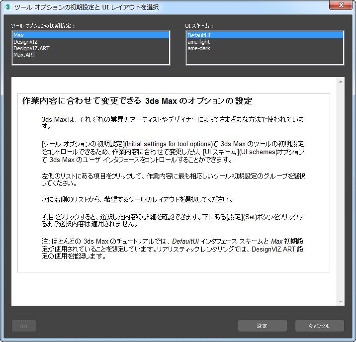 選択した既定値の設定および UI スキームを 3ds Max に適用します。