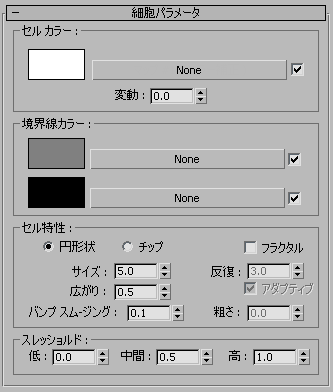 - セル マップをバンプ マップとして使用する場合、セルの境界にエイリアシングやギザギザが表示されることがあります。その場合は、この値を大きくしてください。既定値は 0.1 です。