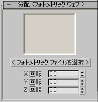 [分配 (フォトメトリック ウェブ)](Distribution (Photometric Web))ロールアウトは、フォトメトリック ウェブ分配が設定されたフォトメトリック ライトを作成または選択すると、[修正](Modify)パネルに表示されます。これらのパラメータは、ウェブの方向を調整したり、フォトメトリック ウェブ ファイルを選択したりするときに使用します。