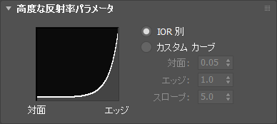 フィジカル マテリアルの[高度な反射率パラメータ](Advanced Reflectance Parameters)ロールアウトでは、マテリアルの IOR またはカスタム カーブに基づいて角度依存の反射率を駆動するかどうかを選択できます。