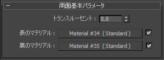 両面マテリアルのコントロールで、2 つのマテリアルとマテリアル全体の透明度を選択できます。