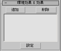 リスト ボックスの中で選択した環境効果またはレンダリング効果を設定することができます。項目が環境効果である場合に、[設定](Setup)ボタンをクリックすると、[環境](Environment)パネルが表示されます。項目が効果である場合、[設定](Setup)をクリックすると、[効果](Effects)パネルが表示されます。