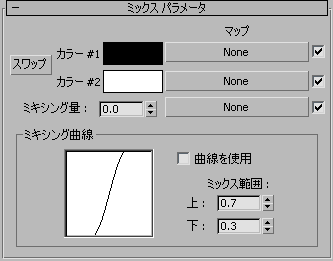 このパラメータにマップが割り当てられていると、[ミックス パラメータ](Mix Parameters)ロールアウトの[ミキシング量](Mix Amount)は使用できません。[カーブを使用](Use Curve)チェック ボックスのチェックマークが消えている場合、ミックス マップはそのまま使用されます。[カーブを使用](Use Curve)チェック ボックスのチェックマークが付いている場合、ミックス マップのグラデーション ランプの効果は変更することができ、ミックス コンポーネントの露出をいろいろと補正して調整できます。