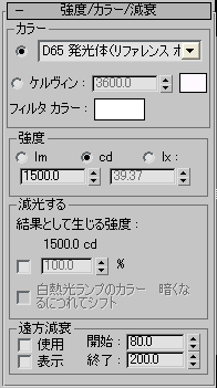 [強度/カラー/減衰](Intensity/Color/Attenuation)ロールアウトを使用すると、ライトの色と強度を設定することができます。また、任意で減衰の限度を設定することもできます。