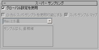 適用するスーパー サンプリングの方法を選択します。このリストは、[グローバル設定を使用](Use Global Settings)のチェックマークを消したときだけアクティブになります。既定値は「Max 2.5 星」です。