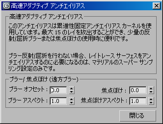 [高速アダプティブ アンチエイリアス](Fast Adaptive Antialiaser)ダイアログ ボックスでは、レイトレース マテリアルとマップの高速アダプティブ アンチエイリアスの設定を変更します。このダイアログ ボックスは、[レイトレース グローバル パラメータ](Raytracer Global Parameters)ロールアウトでグローバルに使用することも、[レイトレース コントロール](Raytracer Controls)ロールアウトでローカルに使用することもできます。アンチエイリアスの設定をローカルに変更する場合は、そのアンチエイリアスのグローバル設定は影響を受けません。