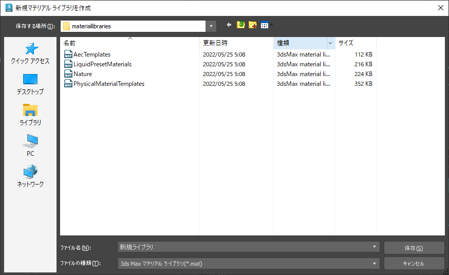 3ds Max がファイル ダイアログ ボックスを表示したら、マテリアルを保存するライブラリ(MAT ファイル)を選択します。
