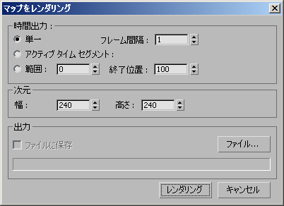 - マップを[レンダリング フレーム ウィンドウ](Rendered Frame Window)の機能縮小バージョンと、選択してある場合はファイルに、レンダリングします。