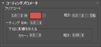 - コーティングが基底のマテリアルの粗さに作用する効果のレベルです。コーティングが粗いほど、基底のマテリアルの粗さにも影響します。