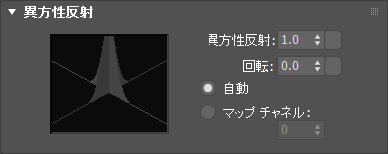 - V 方向の粗さに対する U 方向の粗さです。[異方性反射](Anisotropy)の横にあるボタンをクリックし、マップ、シーン マテリアル、またはサンプルを選択します。