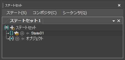[ステート セット](State Sets)ダイアログ ボックスには、[状態](States)、[コンポジタ](Compositor)、[シーケンサ](Sequencer)の主な 3 つのメニューと、それらに対応するパネルが含まれています。各パネルには、状況に応じて内容が変化する複数の右クリック メニューも含まれています。