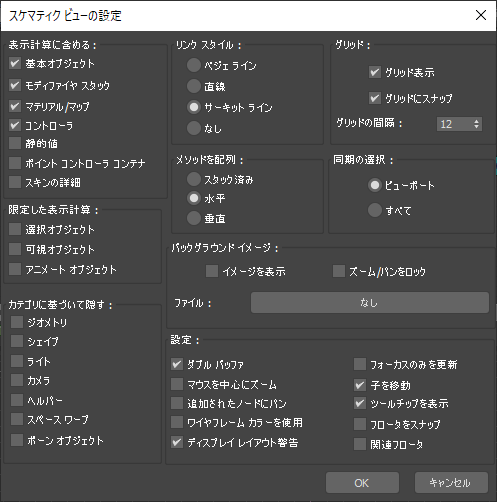 [スケマティク ビュー](Schematic View)ウィンドウにバックグラウンド イメージやグリッドを追加できます。また、配置方法を選択したり、ビューポートの選択と[スケマティク ビュー](Schematic View)ウィンドウの選択の同期方法を指定したりできます。ノードの接続を設定することもできます。このダイアログ ボックスで適当なフィルタを選択することにより、スケマティク ビューでの作業をさらに詳細に制御できます。