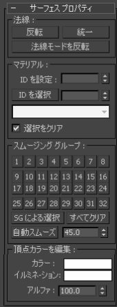 これらのコントロールを使用すると、面法線、マテリアル ID、スムージング グループ、および頂点カラーに対する作業ができます。
