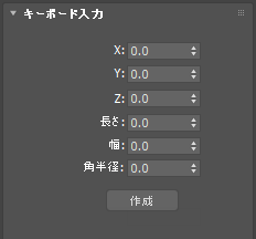 [キーボード入力](Keyboard Entry)ロールアウトには、初めに作成する点のX、Y、および Z 座標の 3 つのフィールドと、スプラインの作成に使用される異なる数のパラメータがあります。スプラインを作成するには、各フィールドに値を入力して、[作成](Create)をクリックします。
