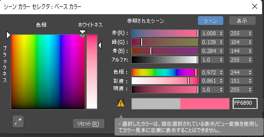 OCIO ベースのカラー管理を使用し、[シーン](Scene)空間でカラーを設定する場合、スライダは黒のストライプを使用してディスプレイ上で再現できないカラーを示します。これらのカラーは選択することができ、ディスプレイには最も近いスクリーンの色が表示されます。さらに、警告記号が表示されます。アイコンの上にポインタを置いて、カラーが表示色域の外側にあるか、レンダリング色域の外側にあるか、またはその両方の外側にあるかを確認します。