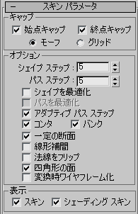 サブオブジェクト シェイプ/パス変換時にロフト スキンが消えます。たとえば、パス上の頂点を移動すると、ロフトが消えます。チェックマークが付いていない場合、このサブオブジェクト変換中にスキンが見えます。既定値ではチェックマークが付いていません。
