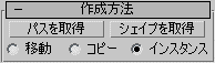 パスまたはシェイプをロフト オブジェクトに転送する方法を指定します。移動、コピー、またはインスタンスによって転送することができます。移動の場合はコピーは残りません。