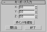 [キーボード入力](Keyboard Entry)ロールアウトの使用により、NURBS カーブをキーボード入力で作成できます。[Tab]キーを使用してこのロールアウト内の各コントロールに移動できます。キーボードを使用してボタンをクリックするには、ボタンがアクティブになっているときに[Enter]キーを押します。