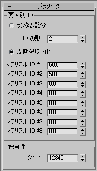 このグループ内の 2 つの選択項目を使用すると、真にランダムなマテリアル ID の配分を作成するか、または設定した割合にしたがって 8 つまでのマテリアルへ割り当てを分割するかのいずれかを実行できます。