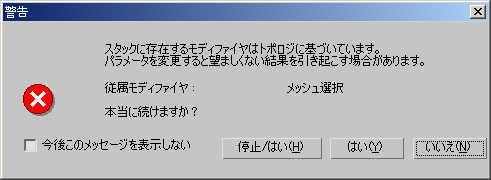 しかし、その他のタイプのモディファイヤの多くは、選択されたサブオブジェクトの明示的なトポロジに作用します。[編集](Edit)モディファイヤと[選択](Select)モディファイヤはその一例です。トポロジに依存するモディファイヤがスタックにあると、それより前のスタック操作を修正して選択範囲内のサブオブジェクト(面や頂点など)の数や順序を変更した場合に、誤った結果になることがあります。そのような操作をしようとすると、状況を警告するメッセージが表示されます。