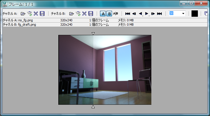 RAM プレイヤーは、イメージとイメージ シーケンスを RAM に読み込み、さまざまなフレーム レートで表示します。このユーティリティにはチャネル A と B があります。2 つの異なるイメージまたはシーケンスをチャネルにロードして同時に表示または再生すると、シーケンスを容易に比較できます。