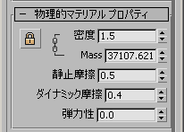 このロールアウトには、物理的マテリアルを使用するための基本的なツールがあり、シミュレーション内でリジッド ボディと他の要素がどのように相互作用するかを制御できます。 特定の値を設定するには、[物理的マテリアル プロパティ](Physical Material Properties)ロールアウト(以下を参照)を使用します。