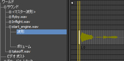飛行機は、フレーム 160 で離陸滑走に入ります。このタイミングに、takeoff.wav オーディオ セグメントの先頭を合わせる必要があります。