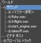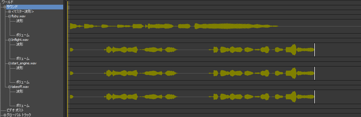 1、2、4 番目のサウンド トラックはモノラルで録音されているため、波形は 1 つしか表示されません。3 番目のサウンド トラック(flyby.wav)はステレオで録音されているため、2 つの波形(左チャネルと右チャネルで 1 つずつ)が表示されます。
