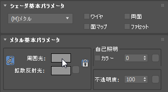 - [メタル基本パラメータ](Metal Basic Parameters)ロールアウトで[周囲光](Ambient)カラー見本をクリックします。