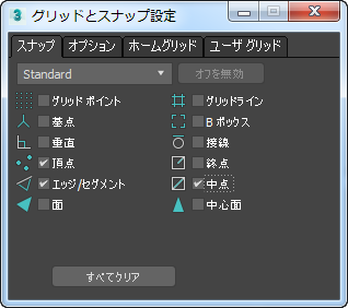 - [スナップ](Snaps)パネルで[すべてクリア](Clear All)をクリックしてから、[頂点](Vertex)、[エッジ/セグメント](Edge/Segment)、[中点](Midpoint)をオンにします。