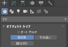 [作成](Create)パネルでドロップダウン リストの矢印をクリックして[ドア](Doors)を選択します。[オブジェクト タイプ](Object Type)ロールアウトで、[基点](Pivot)をクリックしてアクティブにします。