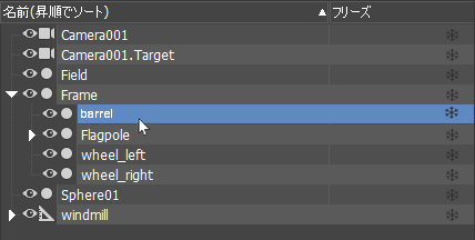 しばらくすると、frame というツールチップが表示され、選択ツールが frame オブジェクトの上に置かれていることを示します。このシーンでは、フレームは大砲の親オブジェクトであるため、フレームが移動すると大砲のアセンブリの残り部分も同様に移動します。