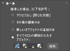 既に説明したとおり、コンテナ内にあるオブジェクトの特定のトラックがロックされていても、[その場の編集のみ](Only Edit In Place)ルールを使用すると、継承したユーザはそのロックを簡単に解除できます。ただし、異なるルールを使用すれば、作成者がルールを変更しない限り、継承したユーザは作成者のロックに従わなければなりません。