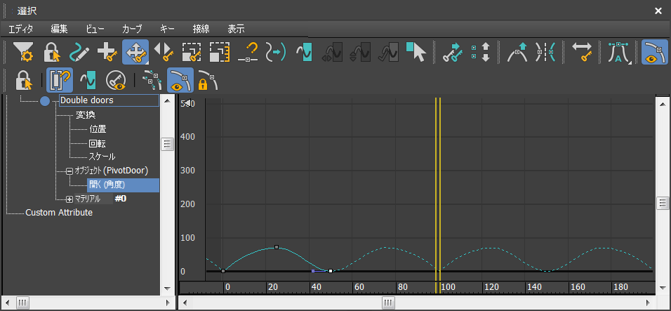 [トラック ビュー - カーブ エディタ](Track View – Curve Editor)ウィンドウが表示され、Double doors の[開く] (Open)パラメータがハイライト表示されています。