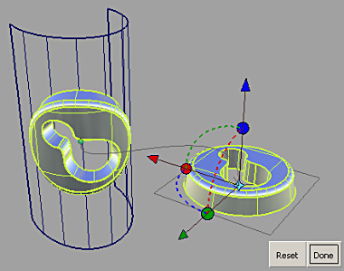 参照プレーンの方向も変更できます。参照プレーンは XY プレーンと平行になるように初期化されます。ターゲットの方向が異なっていると、Conform 操作が意味を成さない可能性があります。マニピュレータの回転ハンドルを使用して参照プレーンを回転させ、オリジナル サーフェスにより正確に合わせることができます。