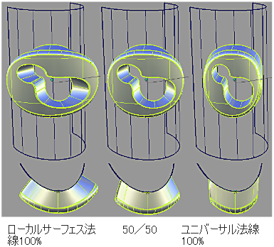 このモードを選択すると、デスティネーションターゲットの端をマップする方法をユーザが定義できるようになります。値が 0.0 の場合、デスティネーションのローカル法線の 100% が使用されます。値が 1.0 の場合は、ターゲットの中心にあるデスティネーションの法線が共通して使用されることを意味します。結果として、ターゲットの辺が平行(parallel)に見えます。これが Parallel Normals モードという名前の由来です。このスライダの既定値は 1.0 です。また、スライダを使用して 2 つの効果をブレンドすることも可能です。