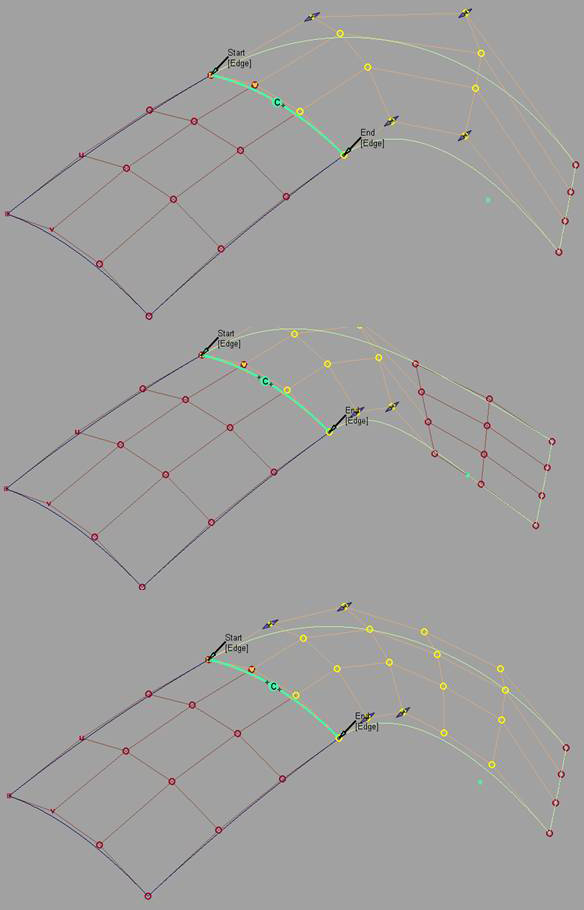 このオプションは入力カーブと入力サーフェスの両方に適用されます。これは内側の列の CV を移動して、入力カーブ/サーフェスに行った修正を均等化します。目的の効果が得られるまで、修正する Extra CV Rows の数と Blend factor を調整します。連続性を維持するために必要な CV の列は移動されません。