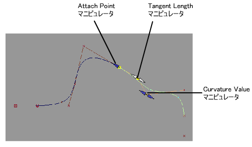 マニピュレータ、またはコントロール ウィンドウのスライダを使用して、Attach Point、Tangent Scale、Curvature Scale、G3 Scale の位置を変更します。