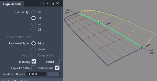 次のセクションは、Alignment Type が Edge に、Continuity が G1 Tangent、G2 Curvature、または G3 Curvature に設定されている場合にのみ表示されます。