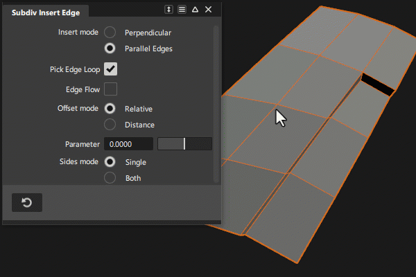 Parallel: 選択したエッジに平行なエッジまたはエッジ ループを挿入します。エッジ ループを挿入するには、Pick Edge Loop をオンにします。Offset モードと Sides モードを使用して、選択したエッジに平行に追加するエッジの位置と数を指定します。
